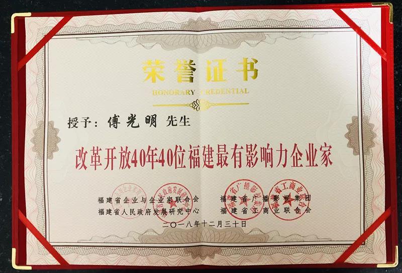 改革开放40年40位福建最有影响力企业家评选,是由福建省企业与企业家联合会、福建省广播影视集团、福建省政府发展研究中心、福建省工商业联合会共同开展的人物评选活动,旨在展现福建企业家在改革开放恢宏历程中的突出贡献,回顾总结福建企业家的创新创业经验,梳理企业家先进典型,表彰40年来对福建经济发展做出重大贡献的企业家代表。此次傅光明董事长获奖,不仅是对其”敢为天下先“的创业精神的充分肯定,更是对350vip葡亰集团集团35年来为福建经济发展做出重大贡献的表彰。