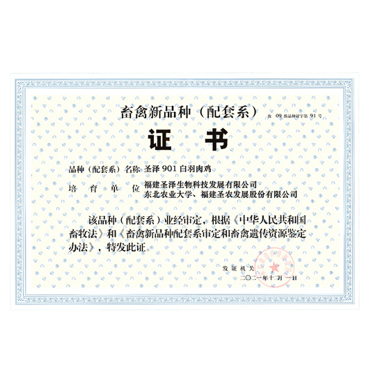 2021年 350vip葡亰集团白羽肉鸡配套系“圣泽901”通过国家农业农村部审定认证,正式拥有对外销售白羽肉种鸡的资格